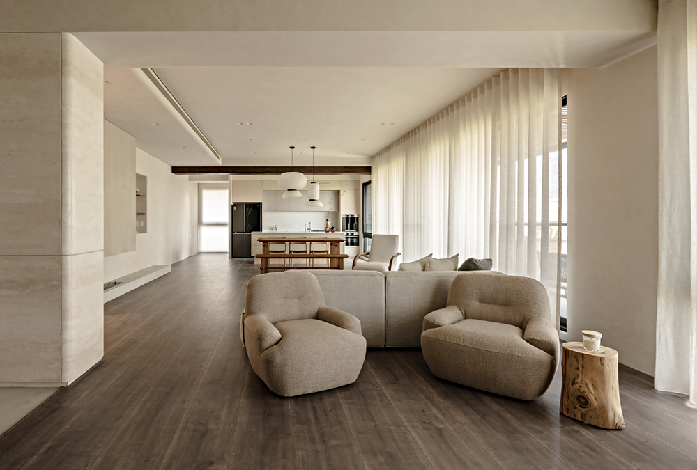 無法精準定義形狀的日式木質大理石面茶几賦于不可言喻的禪意,這時切換到另一頭場景,