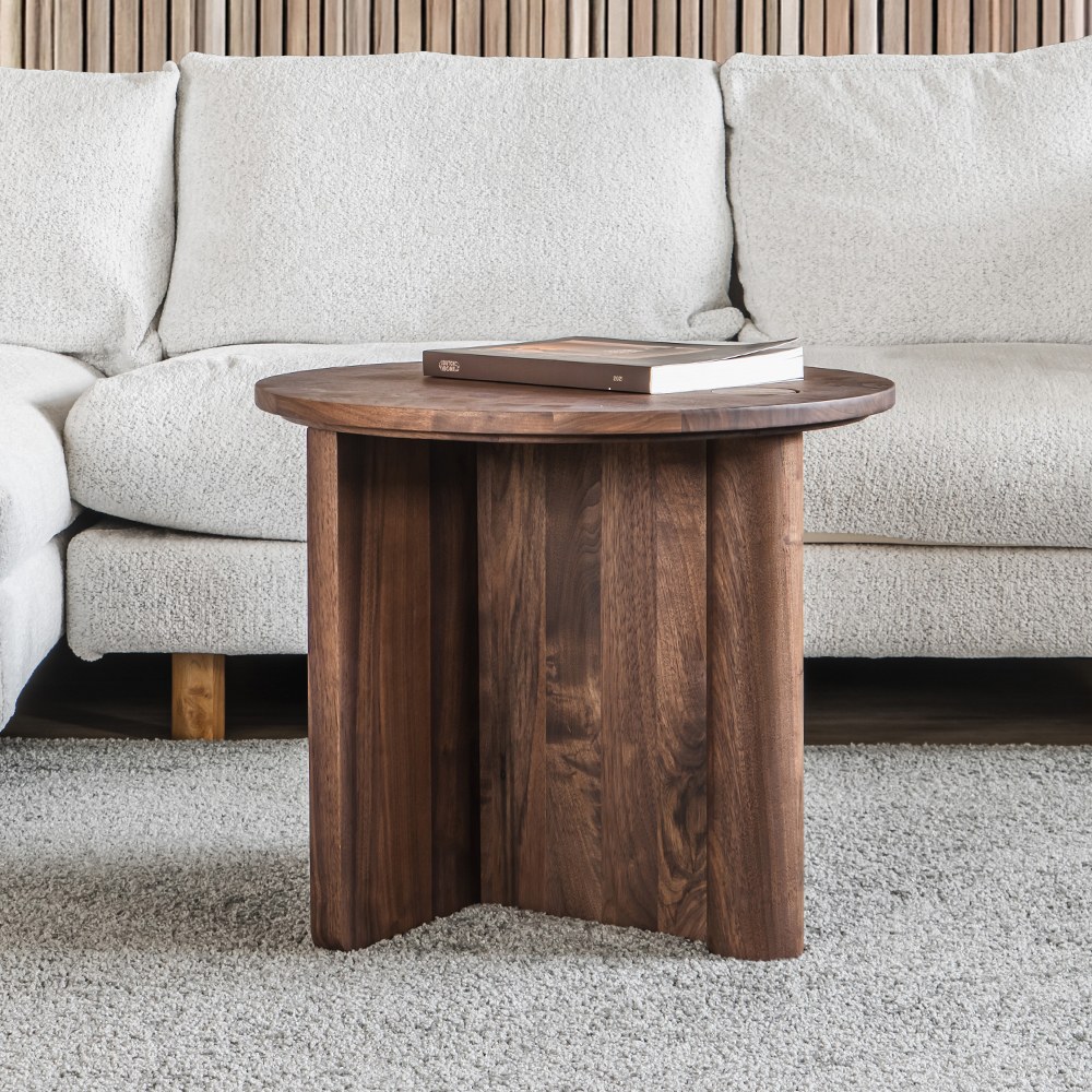 丹麥 Natadora Pivot T字邊桌的設計特色在於一根實木圓柱貫穿與 T 字結構相接,圓潤與平面之間的對比為整體造型增添層次。這根圓柱延伸至桌面。桌尾則以半截木質圓柱呼應主要的圓柱形桌腳,達成視覺上的平衡與呼應。