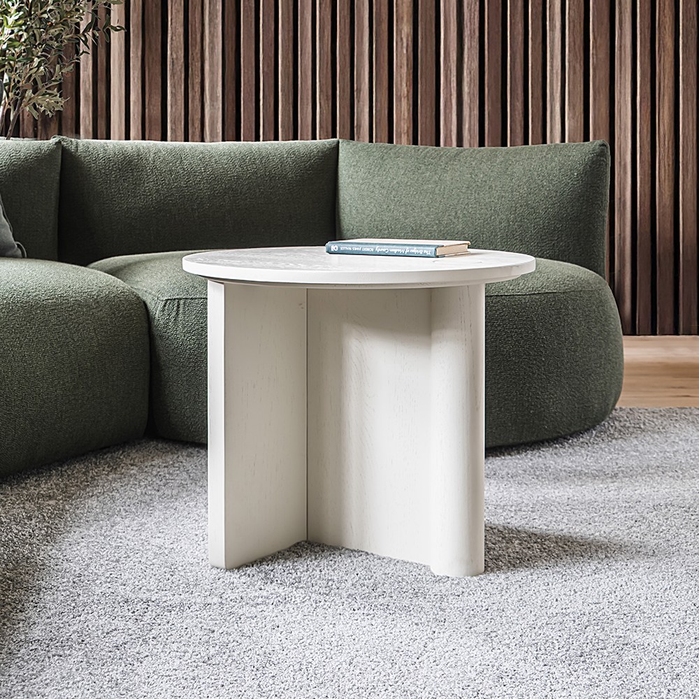 丹麥 Natadora Pivot T字邊桌的設計特色在於一根實木圓柱貫穿與 T 字結構相接,圓潤與平面之間的對比為整體造型增添層次。這根圓柱延伸至桌面。桌尾則以半截木質圓柱呼應主要的圓柱形桌腳,達成視覺上的平衡與呼應。