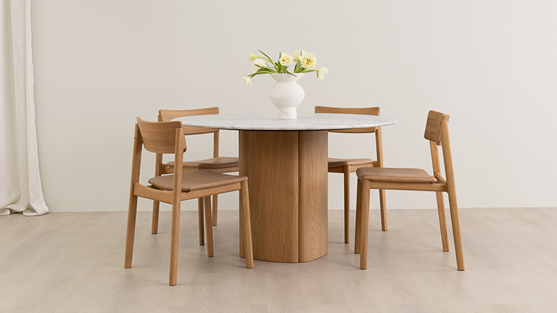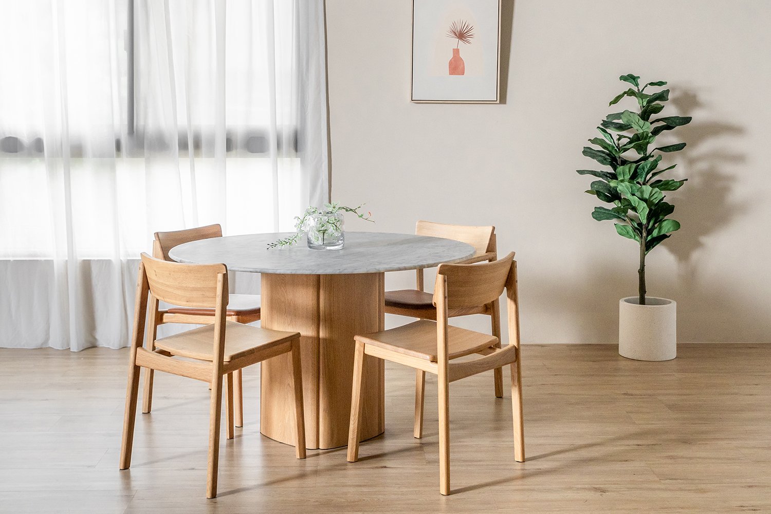 塔拉大理石圓桌,潔白純粹的大理石桌板,以希臘圓柱為概念,打磨出的原木桌腳,簡潔俐落外觀、結構穩固卻不沉重,讓精簡的圓桌流線,為空間營造爽朗的視覺新高度!弧線與斜面之間,圓滿無稜角設計,隱喻家人之間的緊密連結。殿堂級的當代設計款圓桌,有股時髦大器的高級氛圍。