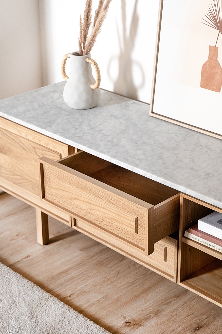 除了手機以外,電視應該是佔據我們視線最久的區域,幾乎是至少一個小時都不會轉移目光;客廳有一半的重點都在電視牆這裡,美觀又能收納整齊的電視櫃顯得格外重要。丹麥Tolv / Sketch新款YORKE電視櫃,有別於大多數以把手的花樣來裝飾櫃體的產品,在木板上刻畫出最原始簡單的線條,製造出線板效果,簡簡單單就達成歐式古典風格,桌面可搭配木頭或大理石,無論自然風格或是低調華麗風格都能輕鬆駕馭。