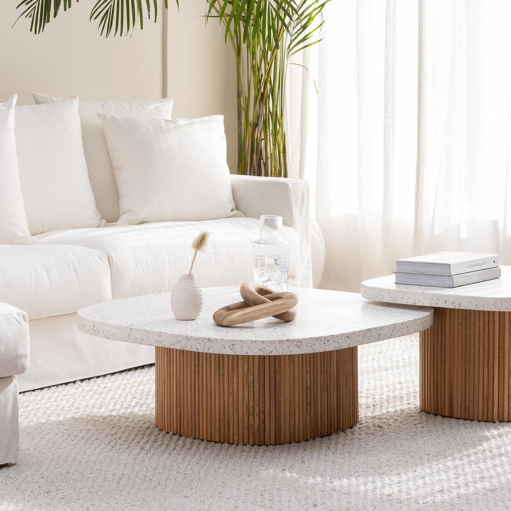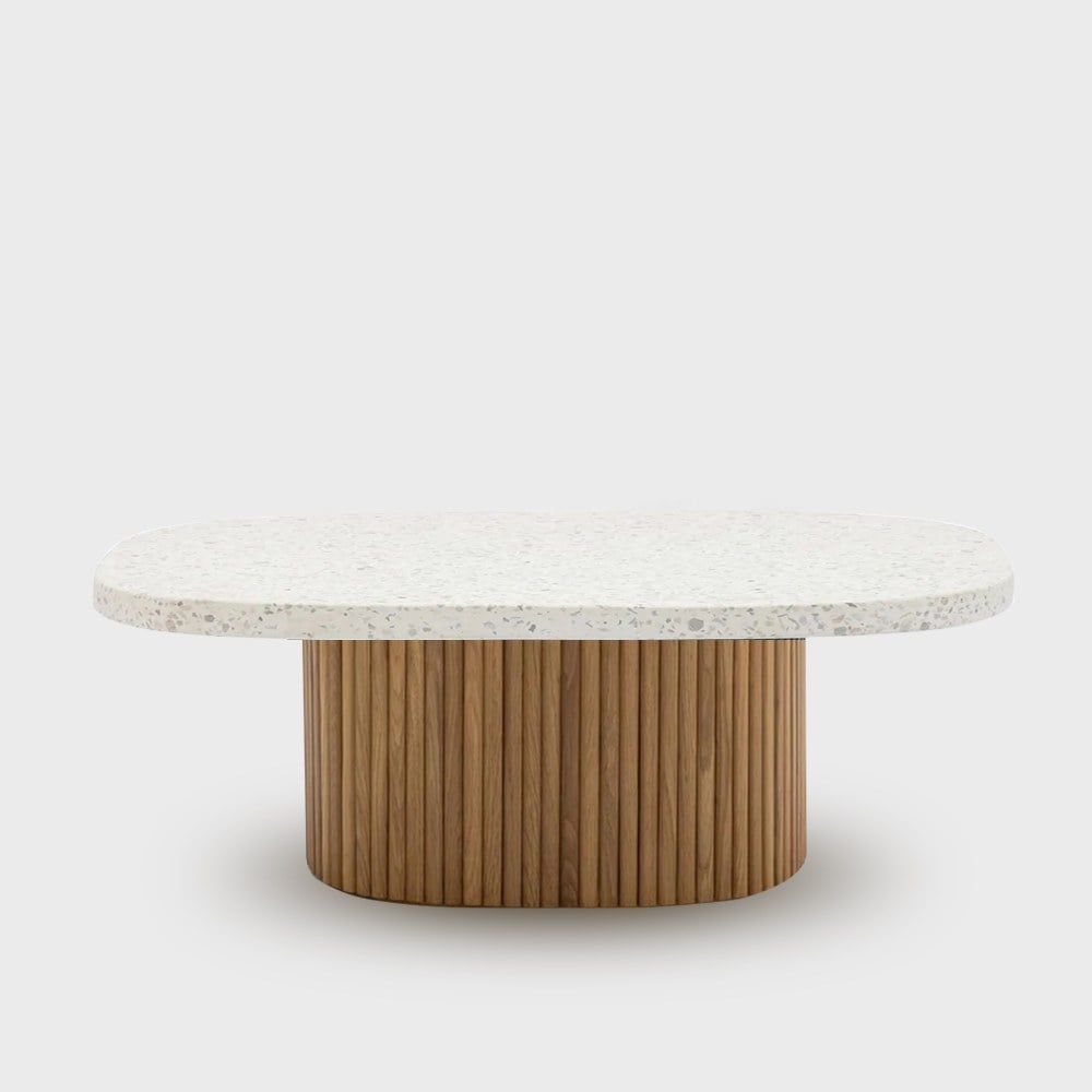 京都詩意水磨石茶几,水磨石桌面讓人瞬間有步入鄉間小徑中的自然溫潤感受,桌腳則是以柵欄式木作圍繞成圓方型,象徵京都式建築的文化,將和風微微沁入你的生活,而同樣為圓方型的水磨石桌面,不僅在居家中很好搭配,也能減去被銳角誤傷的情況。