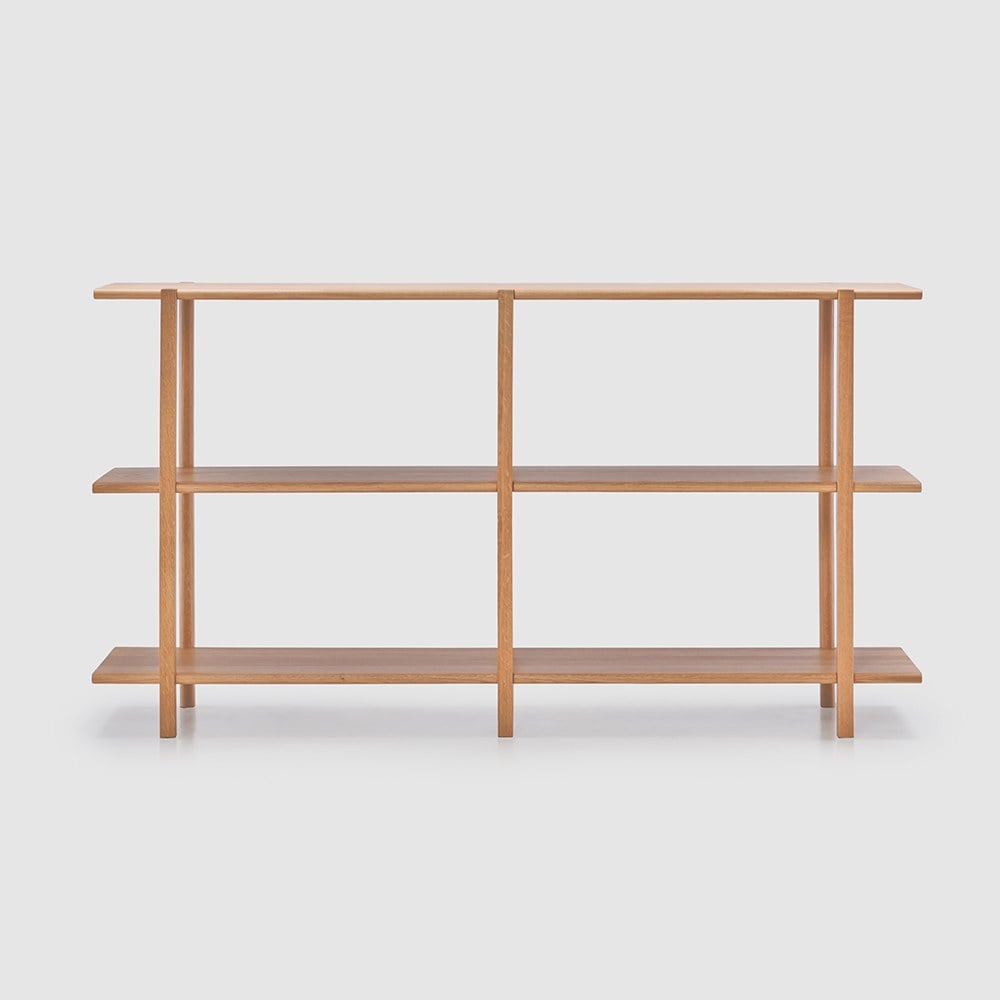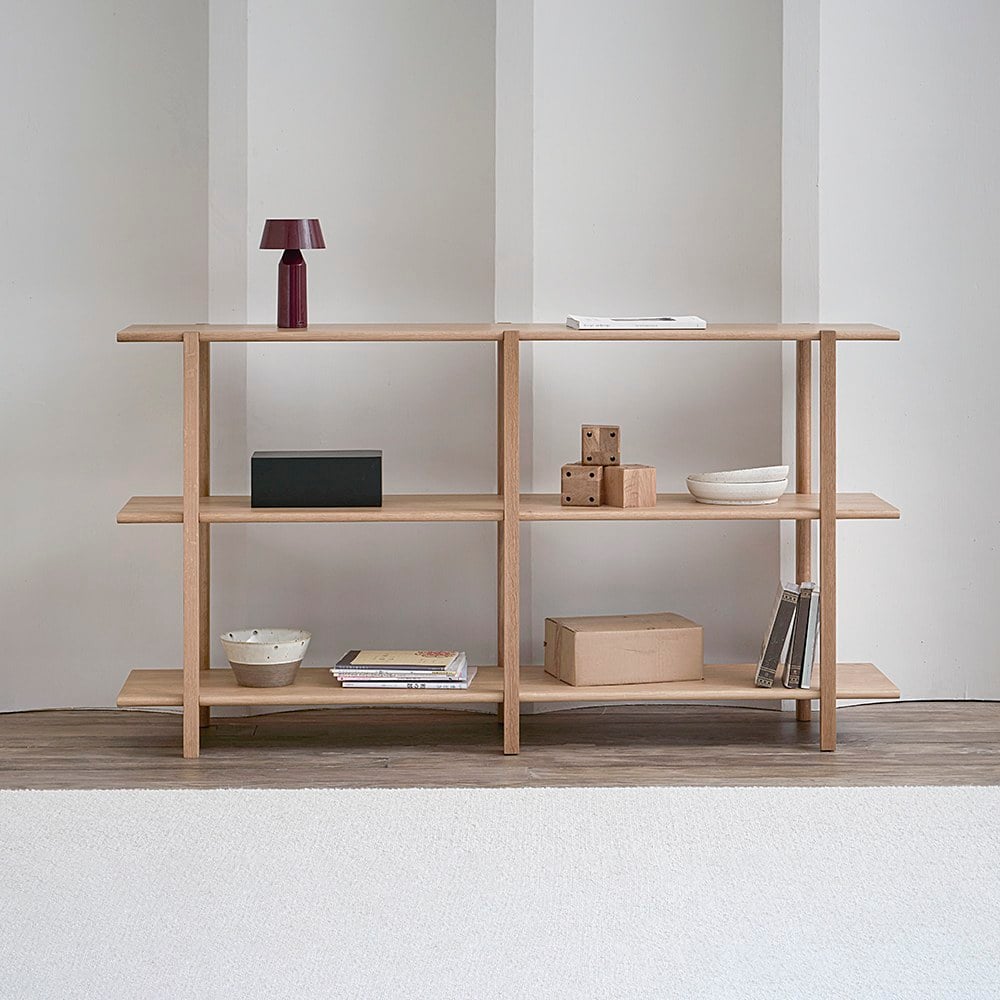 Tolv Farnsworth簡約平面層架兼具堅固性與視覺上的輕盈感。這款受到建築靈感啟發的作品,其美感來自重複出現的互鎖接合設計,用簡潔的水平與垂直線條取而代之。在每個節點處,橡木層板彷彿自然地扣住立柱,展現出輕鬆俐落的效果。Farnsworth 提供兩種不同高度的選擇。