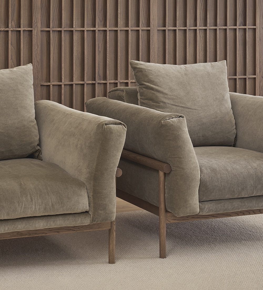 那種感覺不是華麗的高調,而是安靜、有氣質的那種好看。最特別的是它的扶手,布料像是自然地搭在木頭上,柔軟跟堅實在這裡剛好融合在一起。