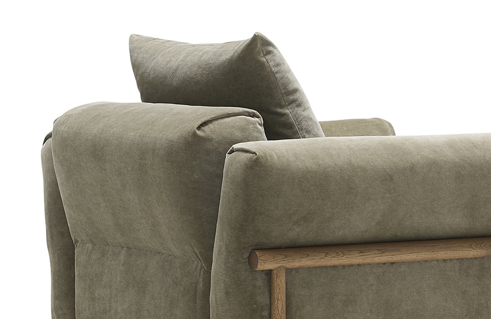 細節部分也能看出設計師的用心。像是布面上的「口袋式摺痕」和順著線條的車縫,都讓沙發多了一點層次感,看起來更自然、更細緻。整體給人的感覺就是:舒服、耐看,又有一點低調的個性。