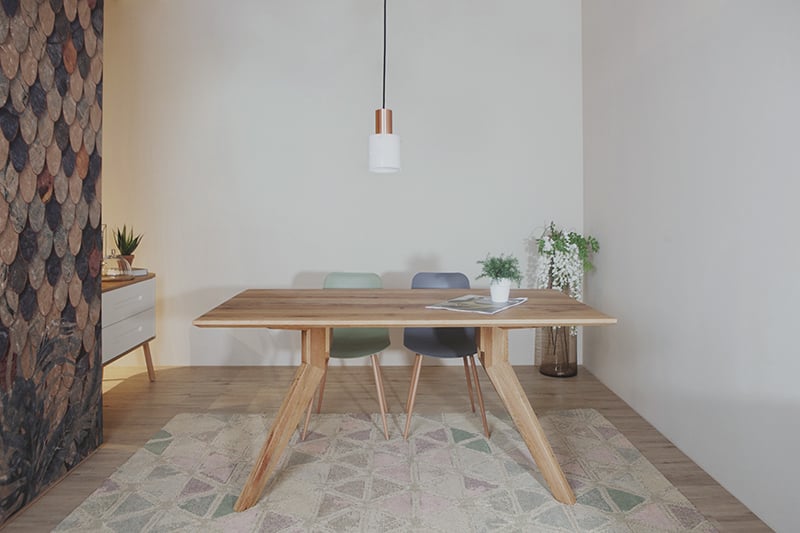 三角洲平原實木餐桌取三角形結構較平緩又穩當的配置,運用簡單的折角讓桌子在各種角度得以呈現出不同的視覺效果,在桌腳的角度和空間關係上的量測更是細微,讓人在兩側短邊的座位也可以坐的舒適,作為餐桌或是工作桌使用都相當大方有型,讓簡約的家居佈置中多一些大自然與現代感融合的韻味與巧思。